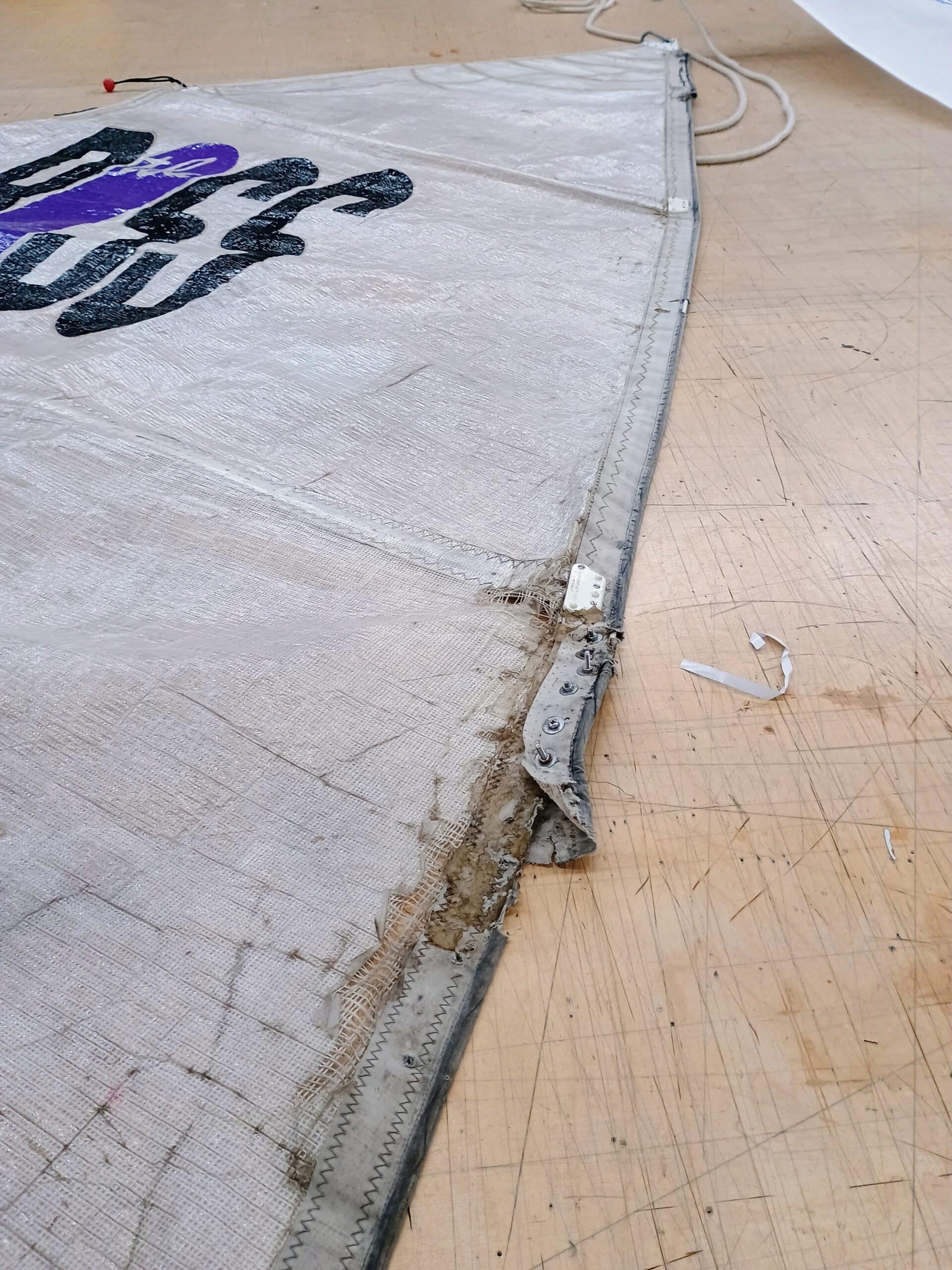 Ici encore la copie d’une voile, Le client est venu avec la voile d’origine de son bateau (de 1994) qu’il avait « rafistolé » au mieux (voir les photos). Les réparations ont tenu, jusqu’à un certain point. Mais en faisant perdre de l’efficacité, et une plus grande difficulté d’utilisation. Les aspérités devaient rendre les manœuvres périlleuses et surtout contribuer à la dégradation de la matière.